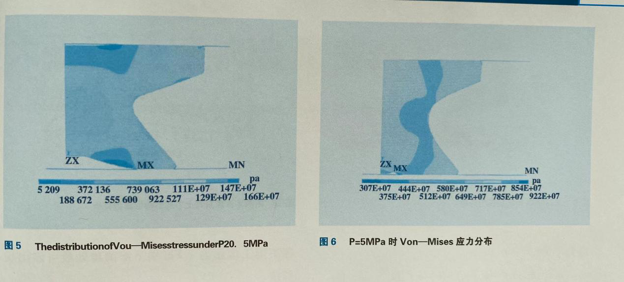 應(yīng)力也明顯增加,上下唇交匯處達(dá)到了5。8MPa.同時(shí)可以發(fā)現(xiàn)Von-Mises應(yīng)力峰區(qū)的位置發(fā)生了變化,并且主要集中在Y形圈下部倒角處。這說明在不同工作壓力下Y形圈下部倒角處最可能出裂紋。