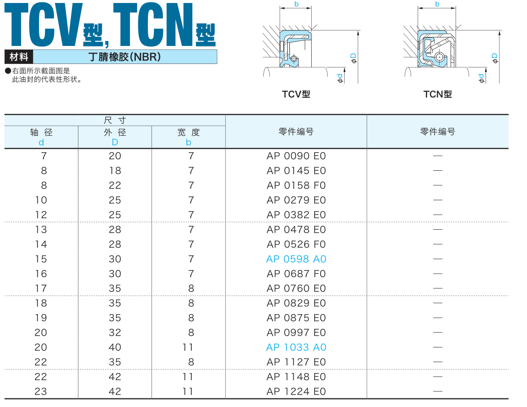 這是比較常用的TCV、TCN耐高壓骨架油封型號尺寸表。